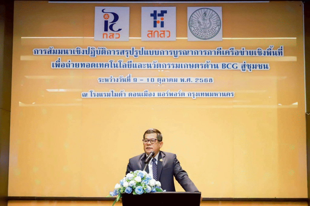 วันที่ 8 – 10 ตุลาคม 2568 นายภูวเดช วุฒิวงศ์วัฒ ผู้อำนวยการสำนักงานส่งเสริมและพัฒนาการเกษตรที่ 5 จังหวัดสงขลา มอบหมายให้นายวิสูตร หมัดหมีด นักวิชาการส่งเสริมการเกษตรชำนาญการ นางสาวธัญญลักษณ์ เกิดบัวทอง นักวิชาการส่งเสริมการเกษตรชำนาญการ นางสาวจิตพิสุทธิ์ ศิริพร นักวิชาการเกษตรชำนาญการ และนางสาวกานต์ชนิต โสพิกุล นักทรัพยากรบุคคลปฏิบัติการ เข้าร่วมการสัมมนาเชิงปฏิบัติการ “สรุปรูปแบบการบูรณาการภาคีเครือข่ายเชิงพื้นที่เพื่อถ่ายทอดเทคโนโลยีและนวัตกรรมเกษตรด้าน BCG สู่ชุมชน” ณ โรงแรม ไมด้า ดอนเมือง แอร์พอร์ต กรุงเทพฯ เพื่อสรุปรูปแบบในการบูรณาการการทำงานเชิงพื้นที่ด้วย App.Tech ด้าน BCG รวมทั้งพัฒนาศักยภาพเจ้าหน้าที่ให้สามารถออกแบบและประเมินความคุ้มค่าโครงการที่เกิดขึ้น เพื่อสร้างการเปลี่ยนแปลงในพื้นที่ โดยมีเจ้าหน้าที่จากกอง/สำนักส่วนกลาง สำนักงานส่งเสริมและพัฒนาการเกษตรที่ 1 – 6 สำนักงานเกษตรจังหวัด สำนักงานเกษตรอำเภอ ศูนย์ปฏิบัติการที่ร่วมดำเนินการ 13 พื้นที่ และหน่วยงานที่เกี่ยวข้อง รวมทั้งสิ้น จำนวน 80 คน เข้าร่วมการสัมมนาฯ โดยได้รับเกียรติจาก นายรพีทัศน์ อุ่นจิตตพันธ์ รองอธิบดีกรมส่งเสริมการเกษตร เป็นประธานในพิธีเปิดการสัมมนาฯ