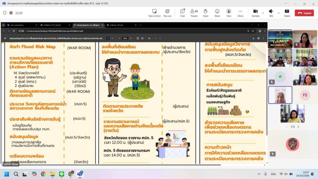 วันที่ 14 ตุลาคม 2568 นายภูวเดช วุฒิวงศ์วัฒ ผู้อำนวยการสำนักงานส่งเสริมและพัฒนาการเกษตรที่ 5 จังหวัดสงขลา พร้อมด้วยผู้อำนวยการกลุ่ม เจ้าหน้าที่ สสก.5 และสำนักงานเกษตรจังหวัด 14 จังหวัดภาคใต้ ศูนย์ปฏิบัติการฯ ร่วมประชุมคณะทำงานสนับสนุนศูนย์ประมวลวิเคราะห์สถานการณ์ภัยพิบัติด้านพืชภาคใต้ (ศปภ.ที่ 5) ผ่านระบบ Zoom Meeting เพื่อเป็นการเตรียมความพร้อมรับสถานการณ์อุทกภัยภาคใต้ที่จะเกิดขึ้น โดยวาระการประชุม ประกอบด้วย การแจ้งคำสั่งคณะทำงานสนับสนุนศูนย์ประมวลวิเคราะห์สถานการณ์ภัยพิบัติด้านพืชภาคใต้ (ศปภ.ที่ 5) ระดับเขต เพื่อการประสานงานที่เป็นระบบ กระบวนการบริหารจัดการภัยพิบัติด้านพืชของ ศปภ.ที่ 5 แนวทางการดำเนินงานตาม โมเดล 453 ผลการวิเคราะห์การพยากรณ์พื้นที่เสี่ยงอุทกภัยภาคใต้ พฤศจิกายน – ธันวาคม 2568 ความก้าวหน้าการจัดทำ Flood Risk Map ระดับจังหวัด/อำเภอ แนวทางการบริหารจัดการภัยพิบัติด้านพืชรายจังหวัด (Action Plan) โดยผู้แทนสำนักงานเกษตรจังหวัดนำเสนอ และแผนการสนับสนุนปัจจัยของศูนย์ปฏิบัติการ (Action Plan) สำหรับการประชุมดังกล่าว เป็นการสร้างการรับรู้ และความเข้าใจร่วมกันทุกระดับเพื่อให้การดำเนินงานของศูนย์ประมวลวิเคราะห์สถานการณ์ภัยพิบัติด้านพืชภาคใต้ (ศปภ.ที่ 5) มีกลไกที่เป็นระบบและดำเนินงานไปในทิศทางเดียวกันต่อไป